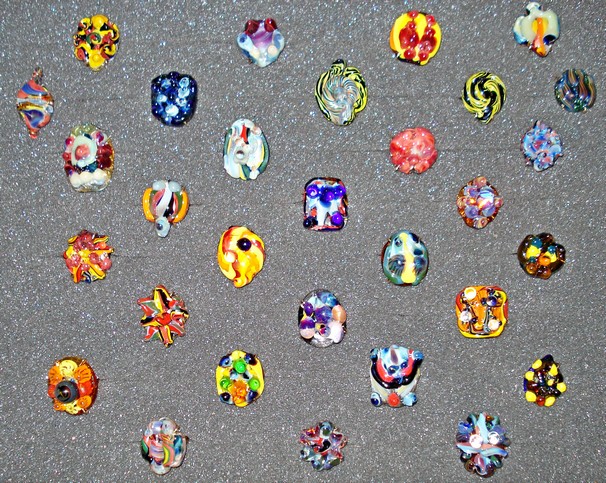 De "stenen" van deze ringen zijn van gekleurd borosilicaatglas (zeer hard), de ringen zijn van fosforbrons en verstelbaar.